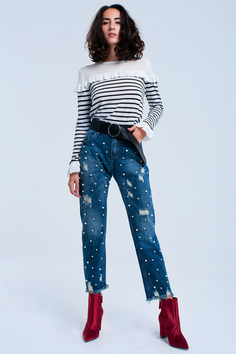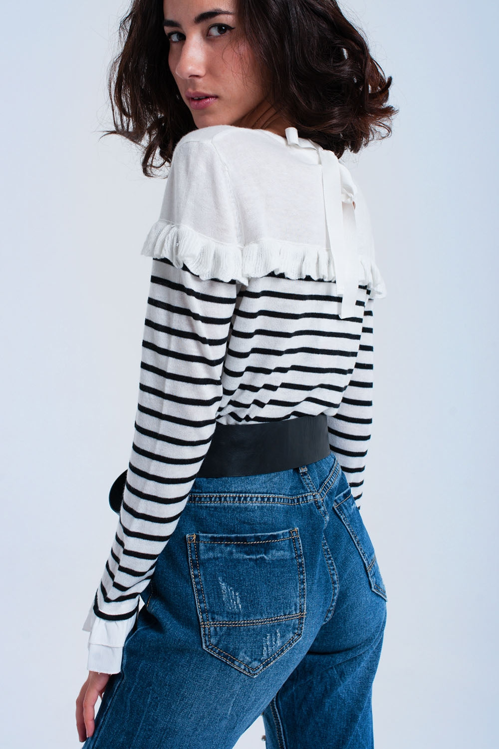 Zwarte gestreepte trui met ruches