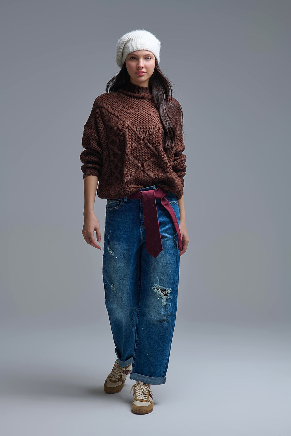 Dropped Shoulder Chunky Cable Knit Brown Pullover