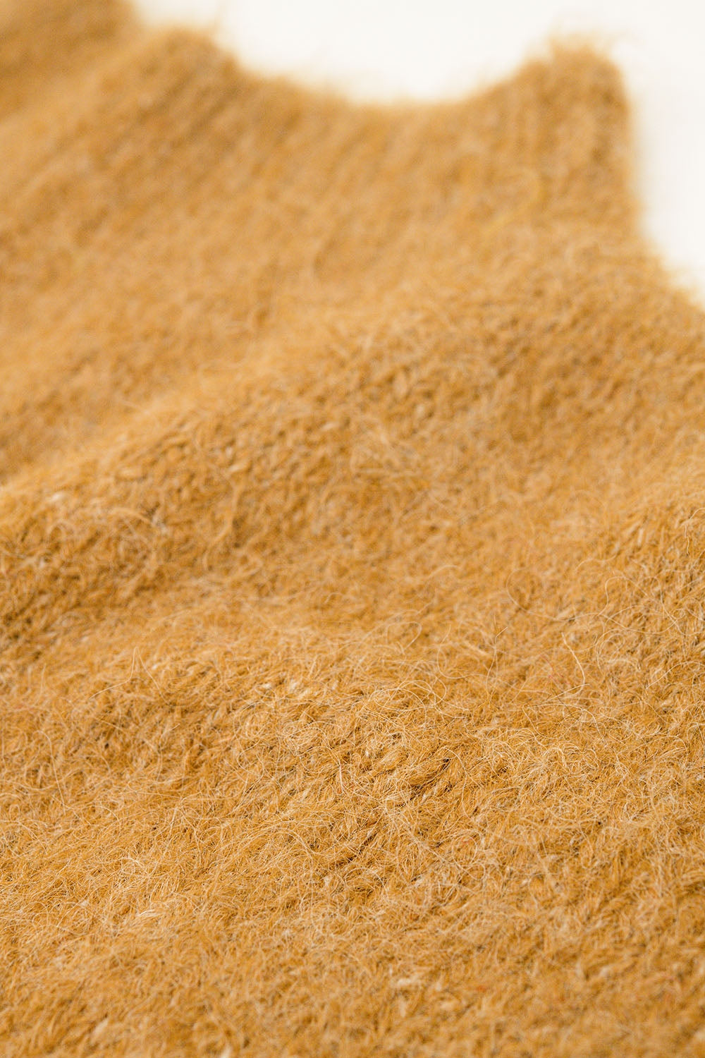 Zachte kamelenkleurige trui met hoge hals en ballonmouwen