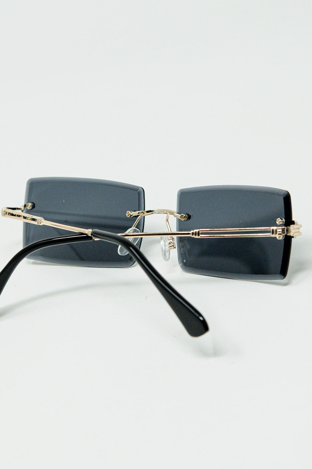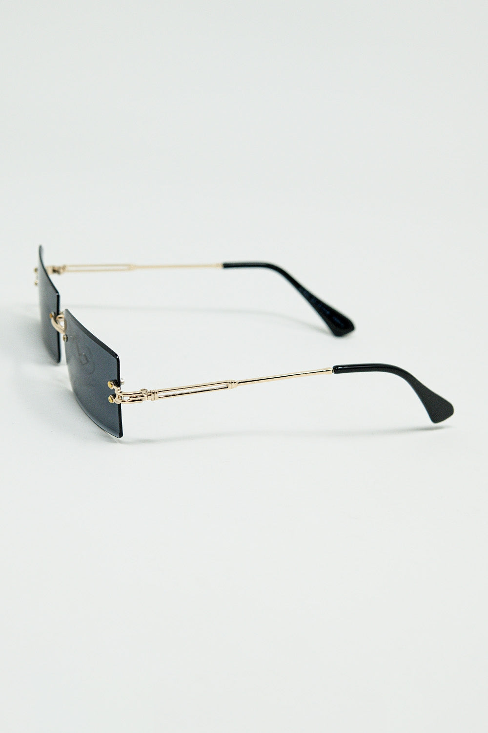 Gouden dunne randloze vierkante zonnebril met zwarte lenzen