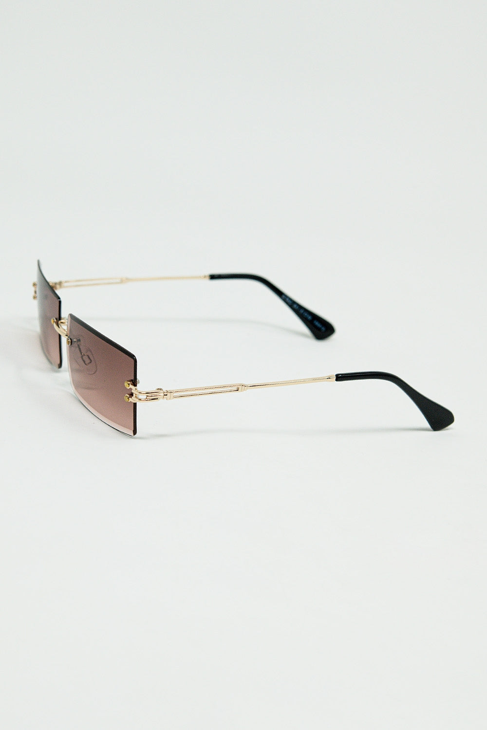 Gouden, dunne, randloze vierkante zonnebril met zachte, bruine gradiëntlenzen