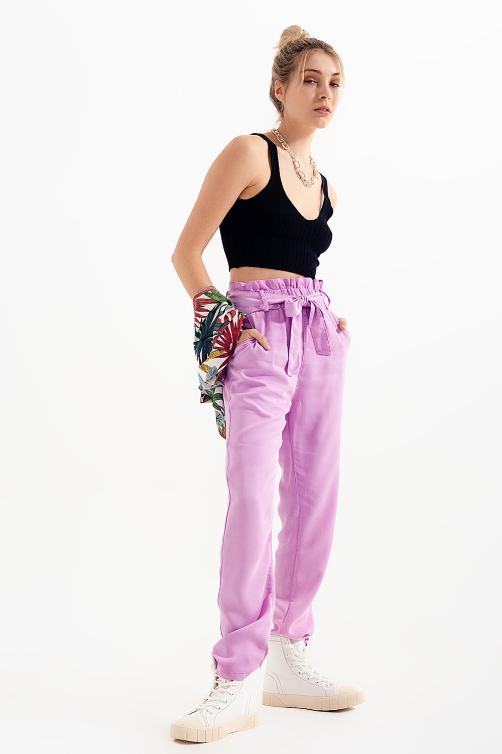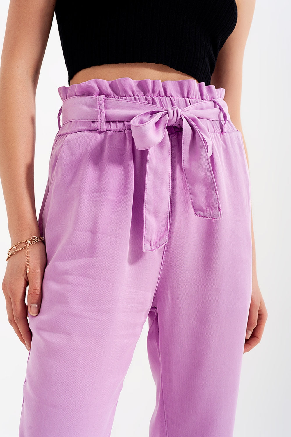 Lichtgewicht broek met strikceintuur in paars