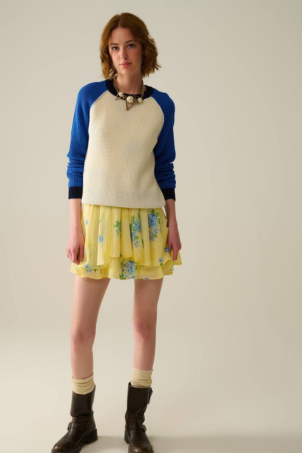 mossteek gebreide trui met contrasterende mouwen in blauw