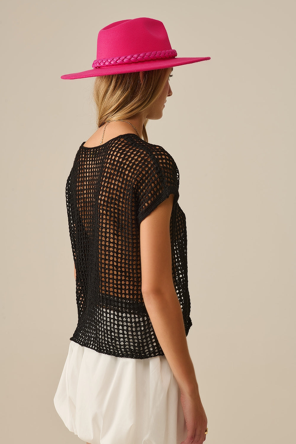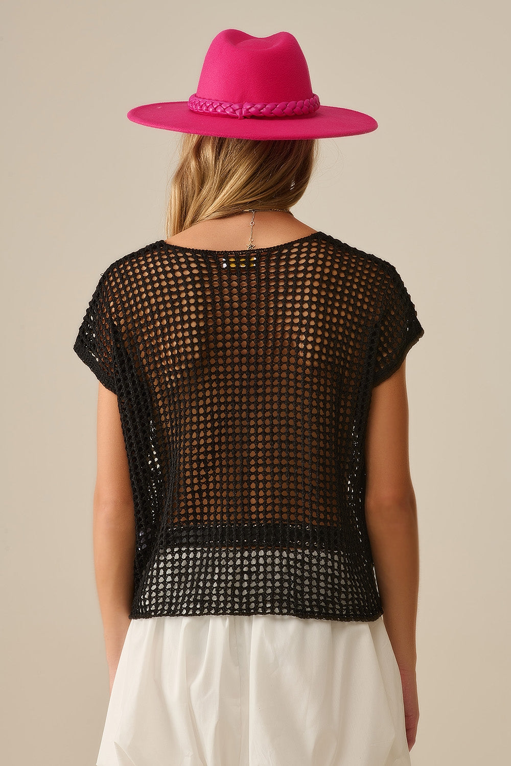 Open gebreide gehaakte top met verlaagde mouwen in zwart