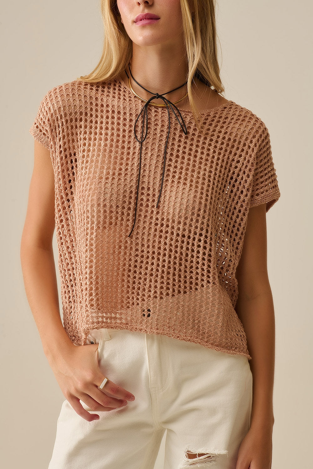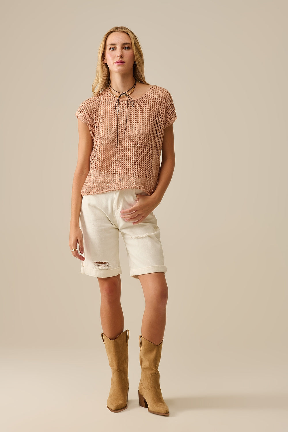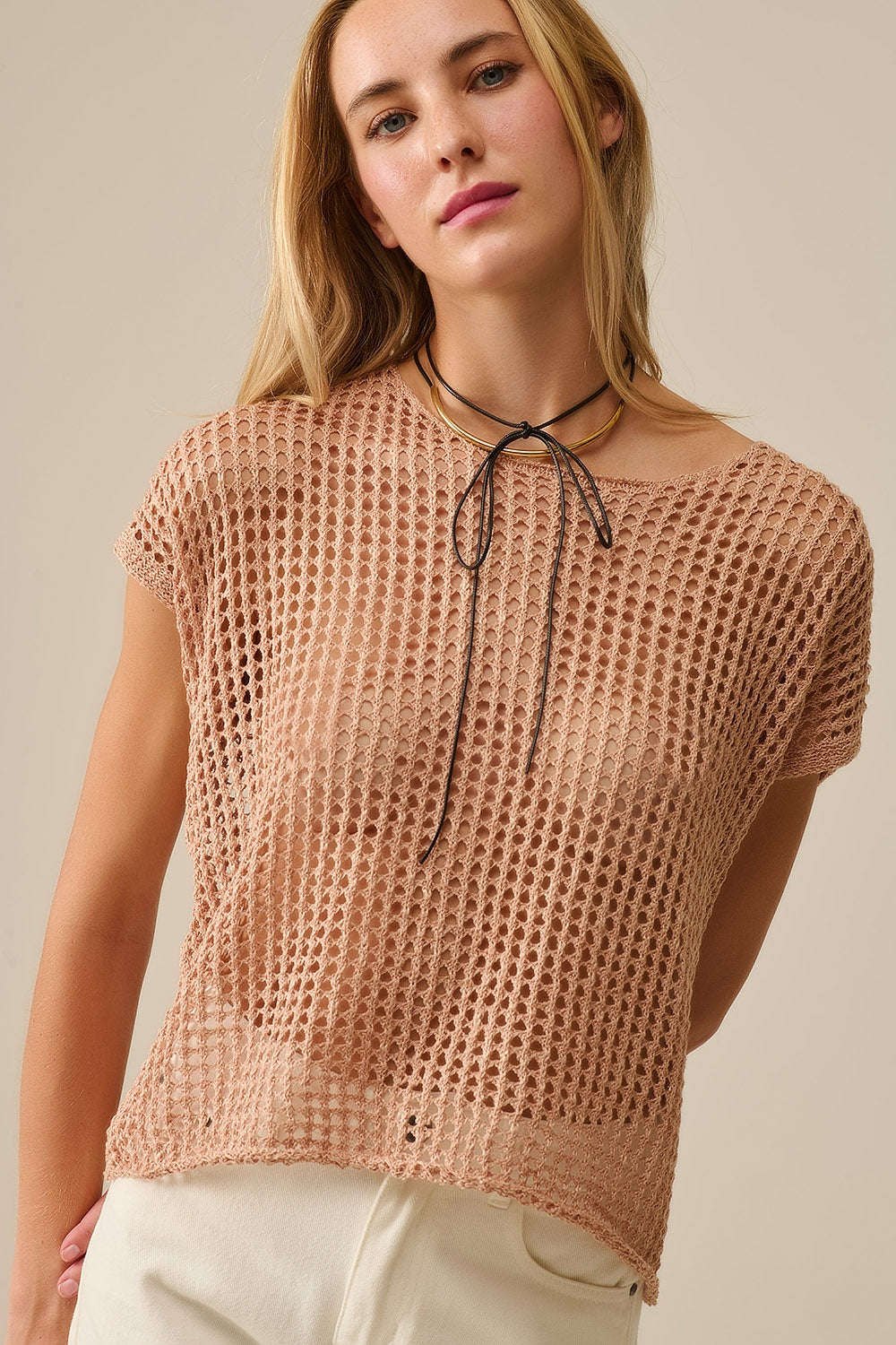 Open gebreide gehaakte top met verlaagde mouwen in camel