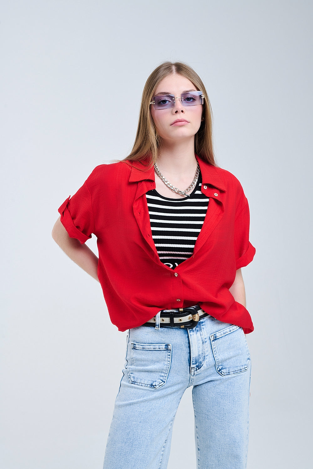 Rood overhemd met korte mouwen en plooi op de mouw