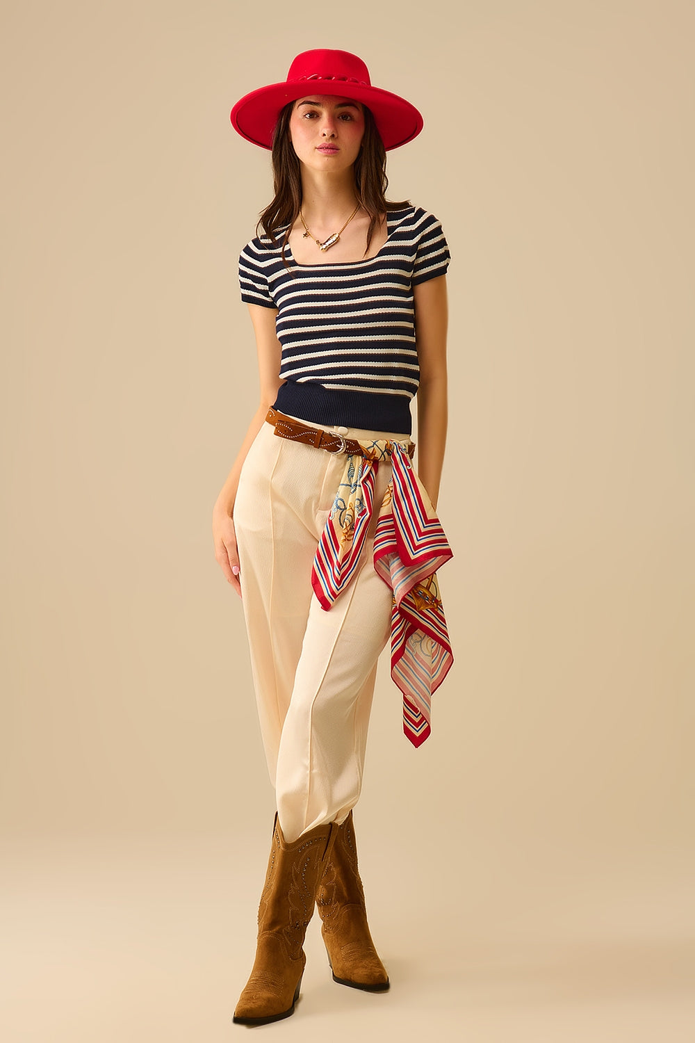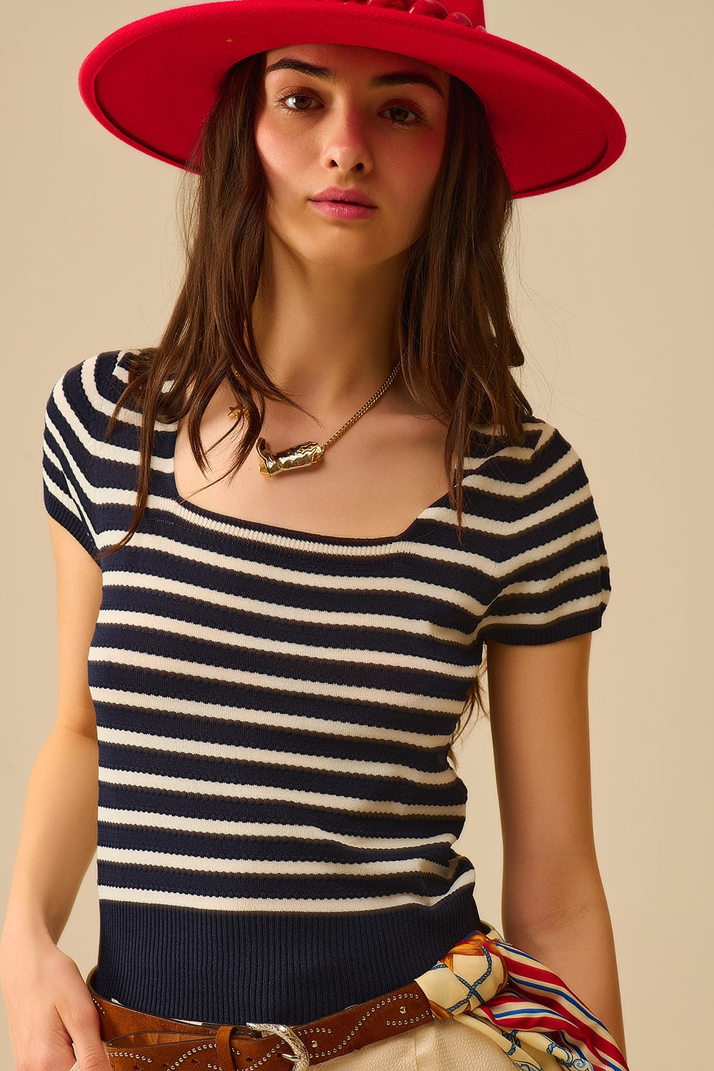 Gestreepte trui met vierkante hals in marineblauw en wit