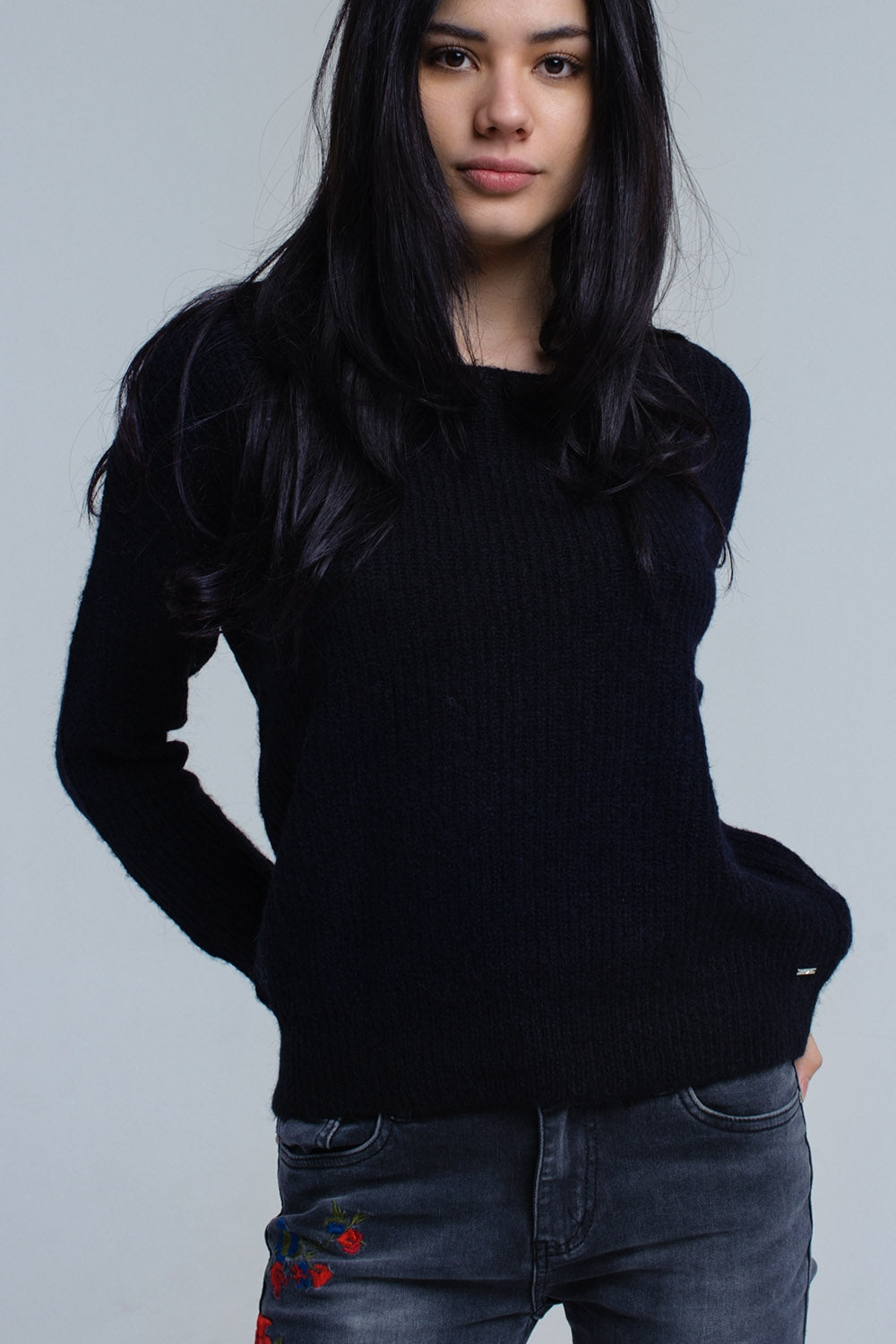 Black knitted sweater with tie-back closure
