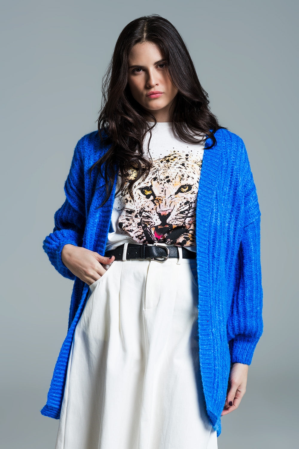 Chunky Rib Cardigan With 3/4 Sleeve in Royal Blue