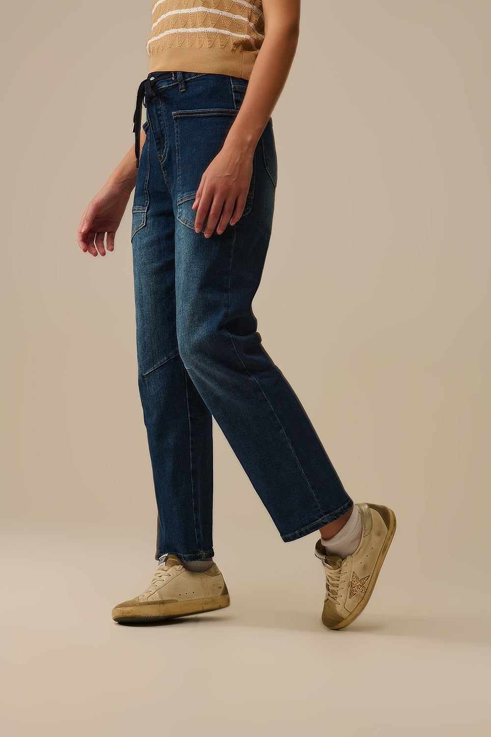 Subcategory: Jeans. Fit: Relaxed fit. Leg: Straight. Style: Daily. Fabric: Stretch denim. Pockets: Side pockets . Zipper: Drawstring closure. Waist: Elasticated drawstring waist. runs true to size. S.