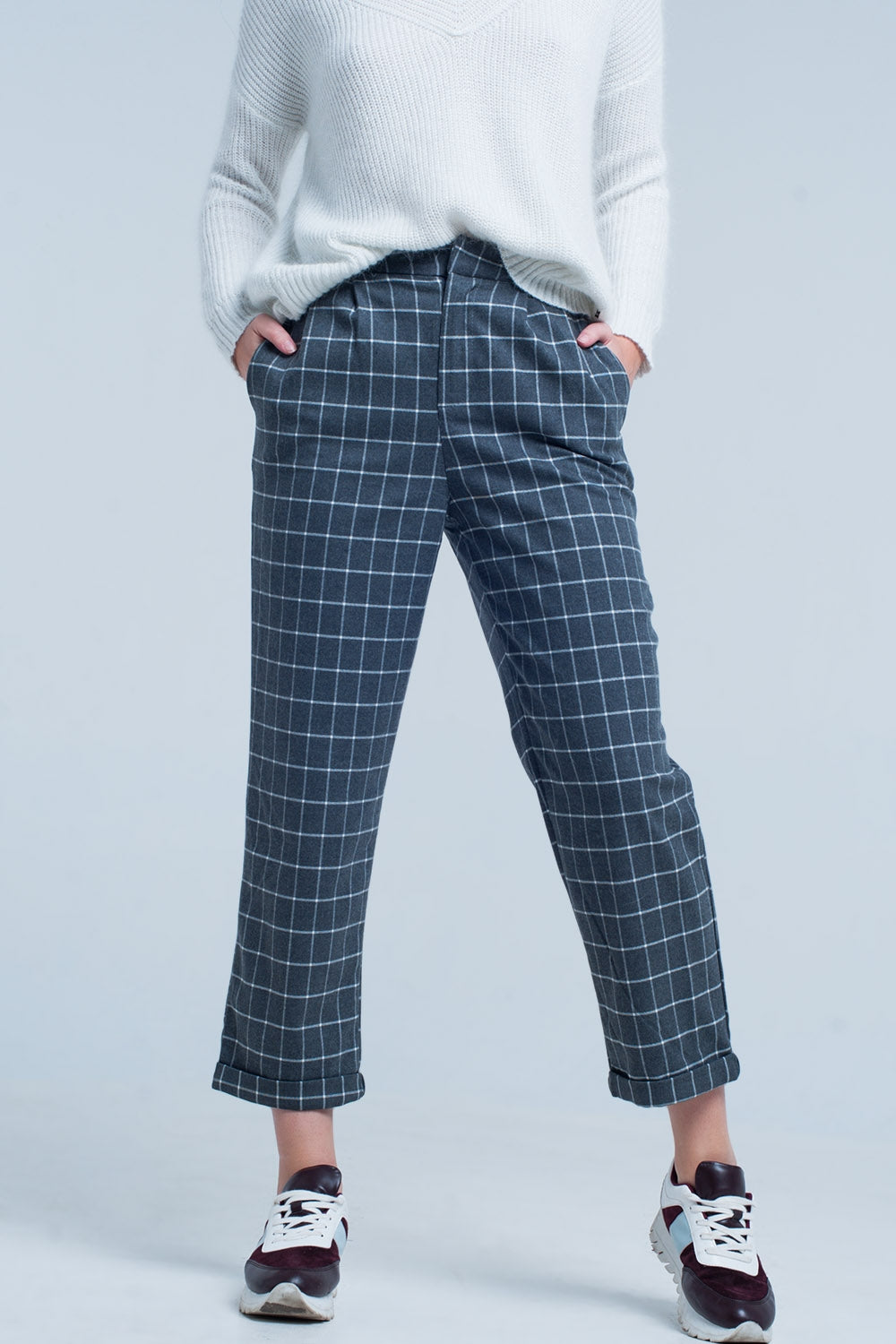 Grey Pants in White check Print