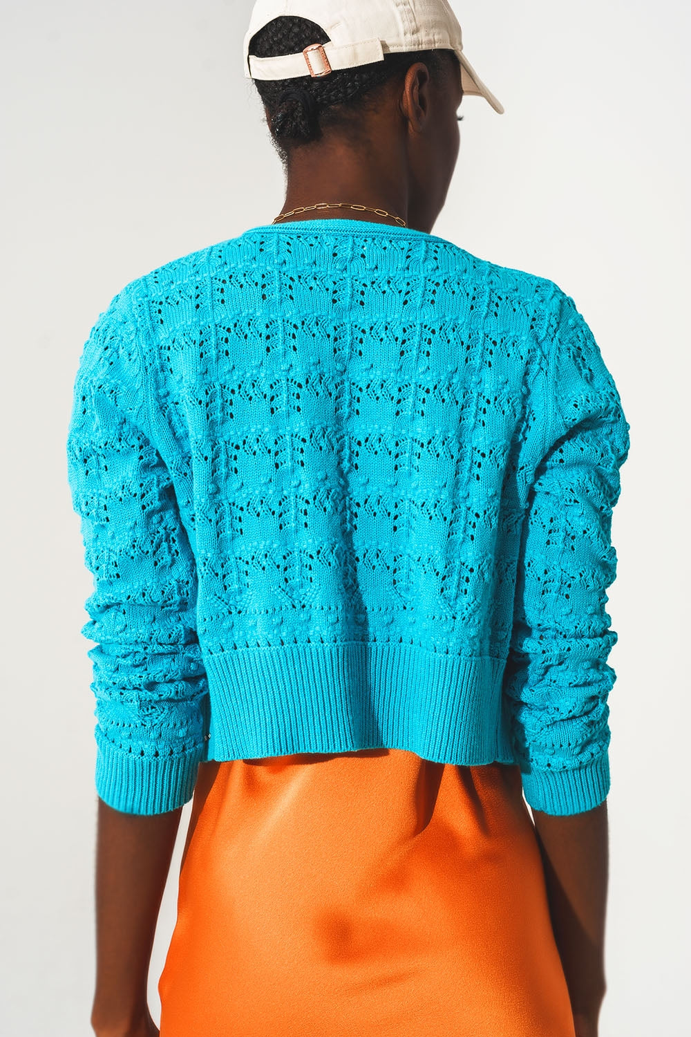 Length: Cropped length. Subcategory: Cardigan. Collar: V-neck neckline. Sleeves: Long Sleeves. Fit: Wrap front. Style: Romantic. Detail: Button detail. Fabric: Pointelle knit. Zipper: Partial button placket. runs true to size. S.