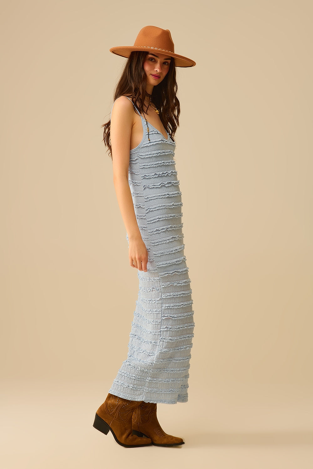 Ruffle Maxi Dress With Slit in blue color