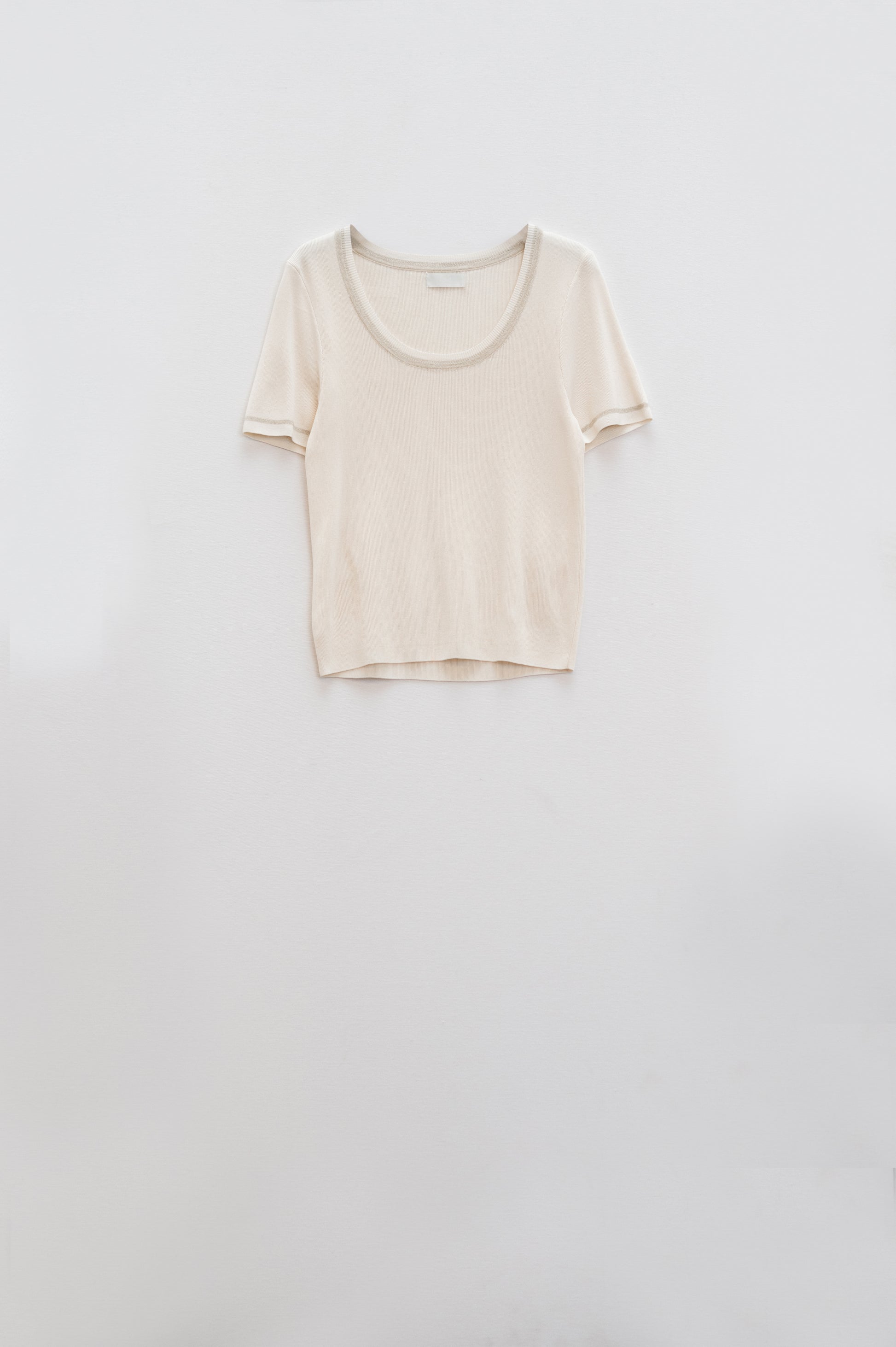 Short Sleeve sweater In beige With Silver Seam at Round Neck