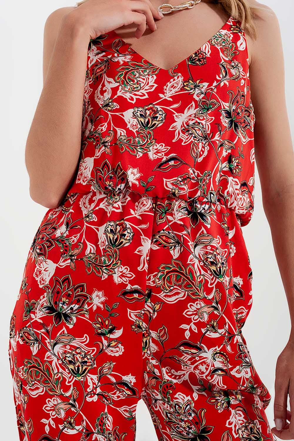Macacão com alças finas e estampado floral vermelho
