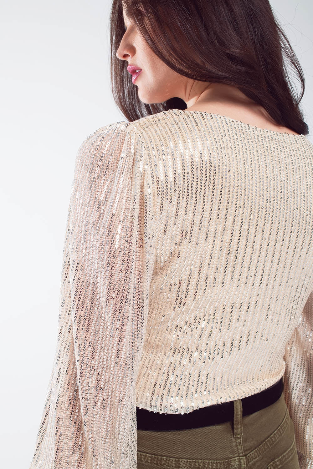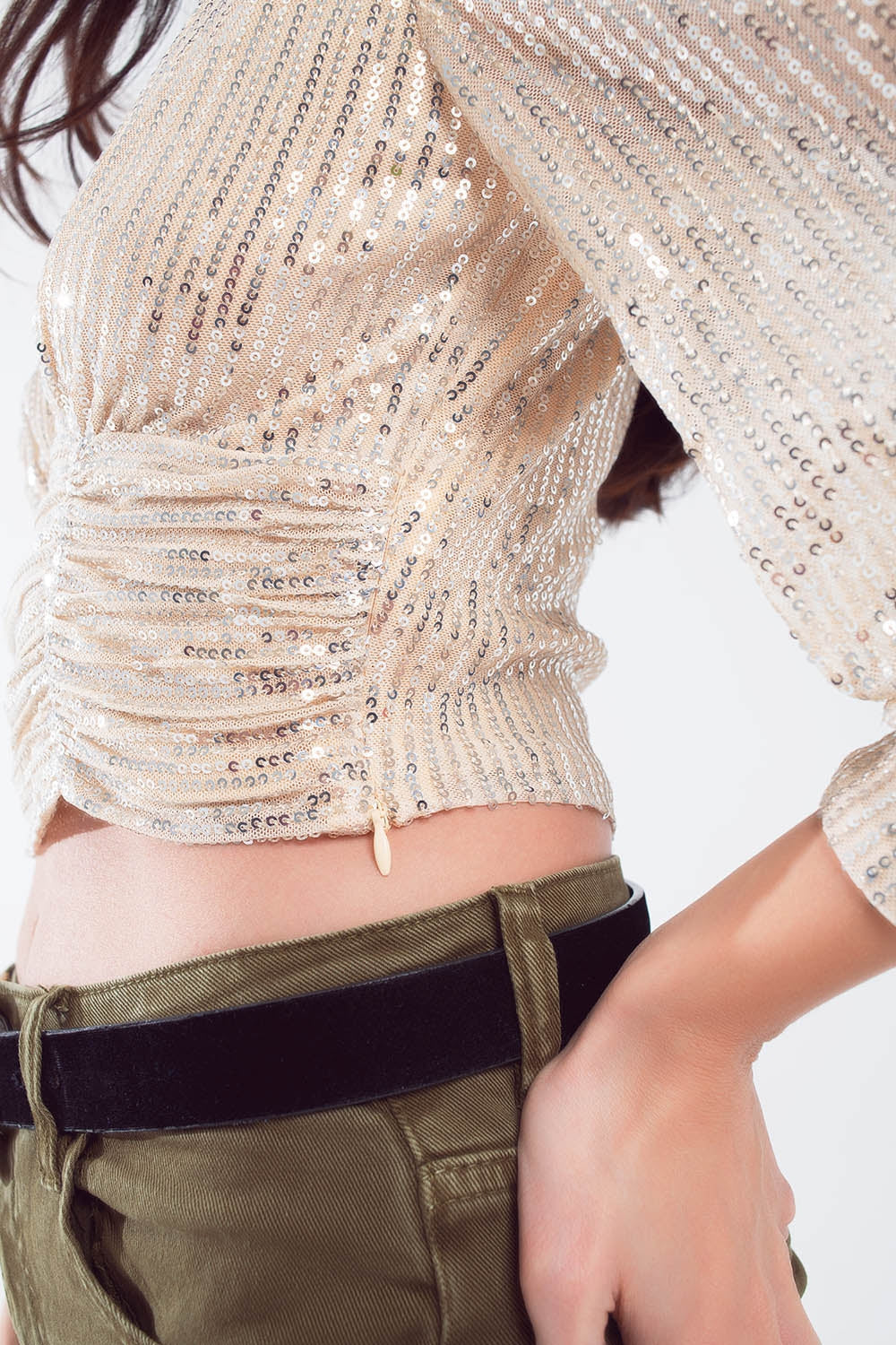 Top curto de manga comprida com lantejoulas, decote em V e design franzido em branco pérola