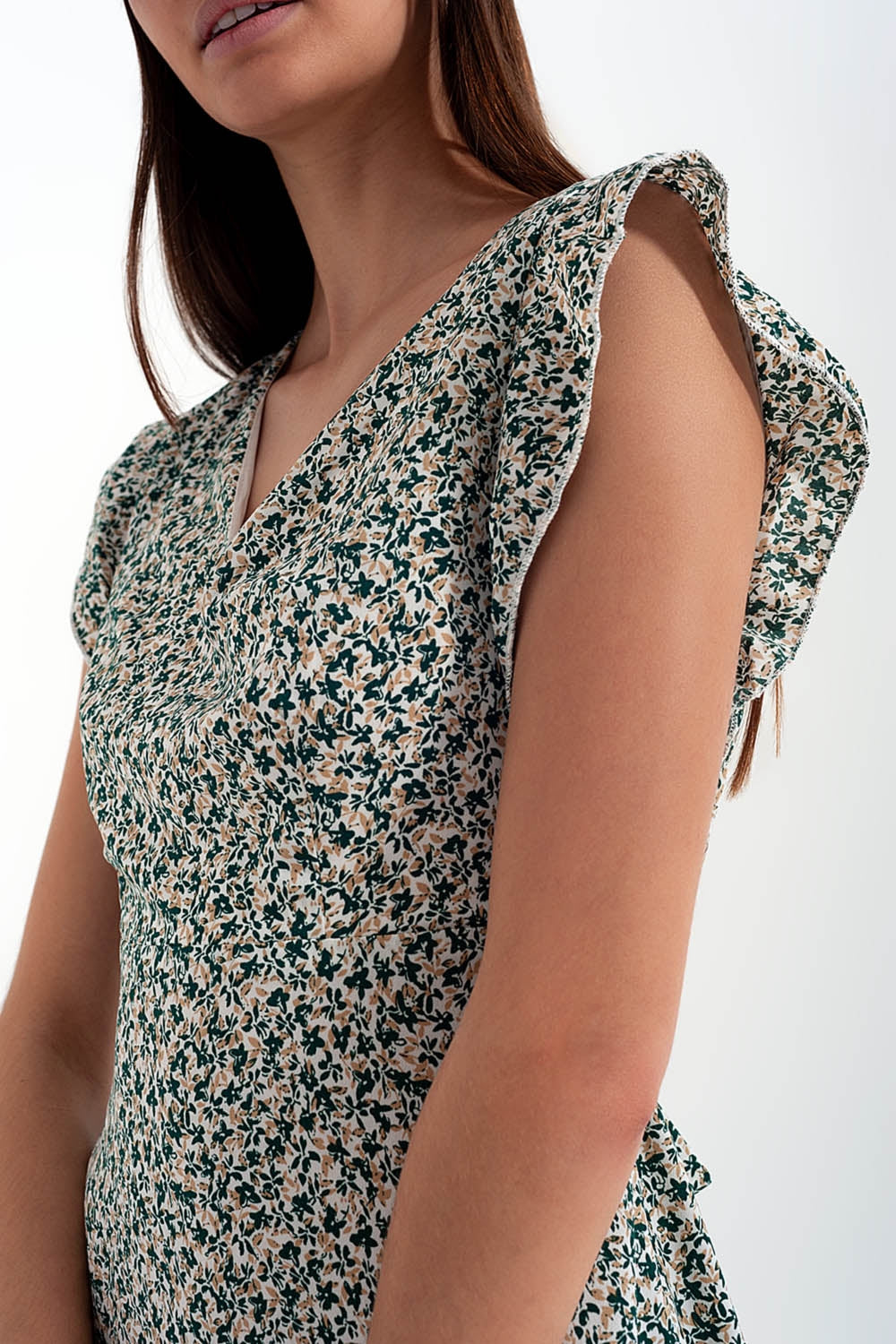 Vestido curto com mangas franzidas em estampado floral ditsy em verde